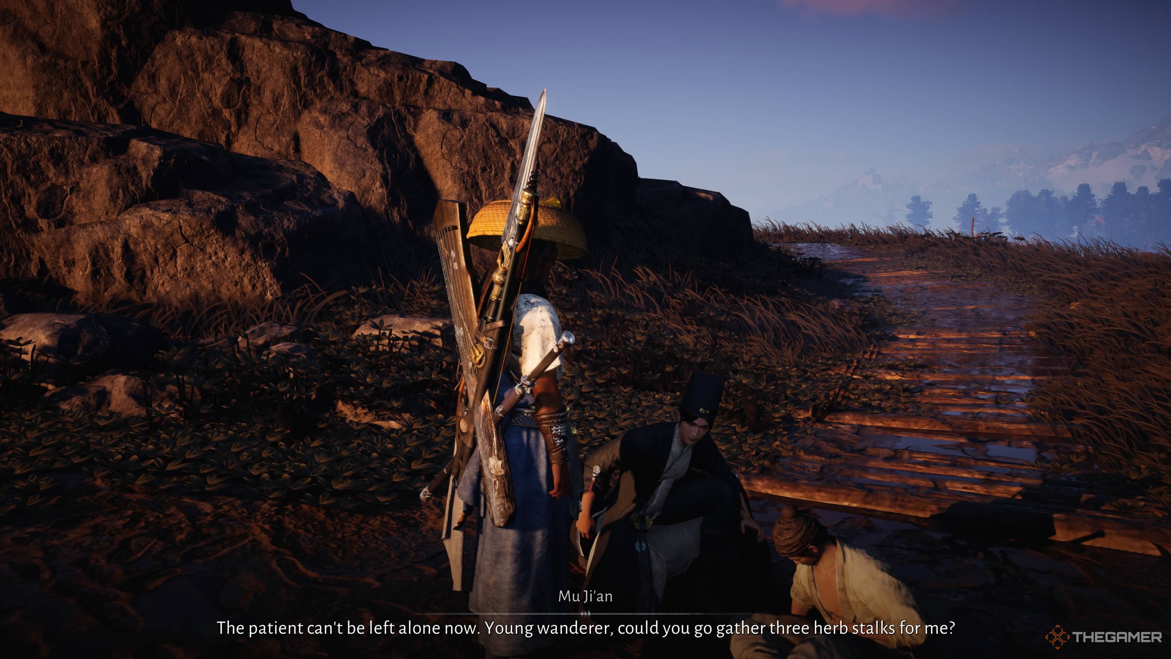 Для начала, выполните задание под названием ‘Healer’s Legacy’. Вы найдете его к северу от Qinghe, недалеко от деревни Mercyheart Village. Там вы встретите доктора по имени Mu Ji’an, который пытается помочь пациенту, но нуждается в травах. Он попросит вас собрать их, и, к счастью, они находятся неподалеку.