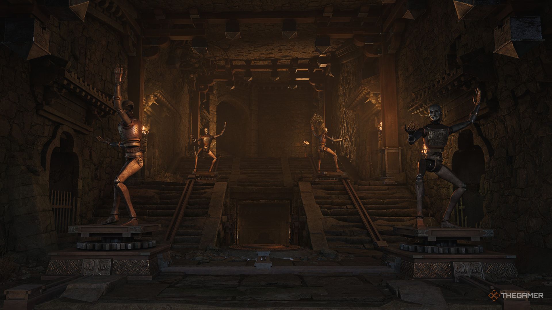 Теперь вернитесь на верхний уровень и встаньте на шестерню. Поворачивайте статуи, пока они не совпадут с теми, что на нижнем уровне, затем зафиксируйте их в этом положении. Это откроет проход в следующую секцию.
