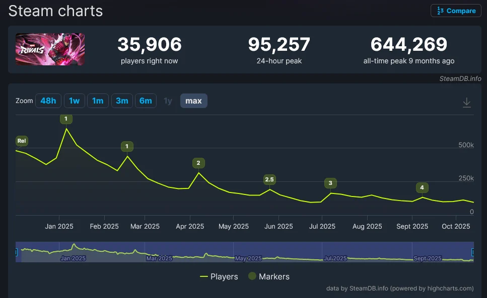 Хотя графики Steam не всегда являются надежным способом оценки успеха игры, удержание и расширение базы игроков имеет решающее значение для постоянно развивающихся игр-сервисов, таких как Marvel Rivals. Как отметила Forbes, падение числа игроков почти на 85% в течение года вызывает серьезную озабоченность.