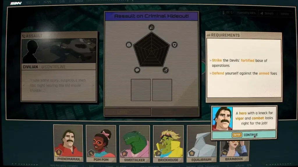 Первая серия Dispatch начинается с того, что Blonde Blazer даёт Роберту VR-машину, чтобы он быстро освоил свою новую работу. Это послужило учебным пособием игры, показывающим игрокам, как работает система ‘dispatching’. Это на удивление просто, не только потому, что это учебное пособие, но и потому, что вы управляете командой исключительно умелых героев с усиленными характеристиками, что делает каждую задачу лёгкой. Мы работали вместе с Phenomaman, который является одним из самых сильных персонажей Dispatch.