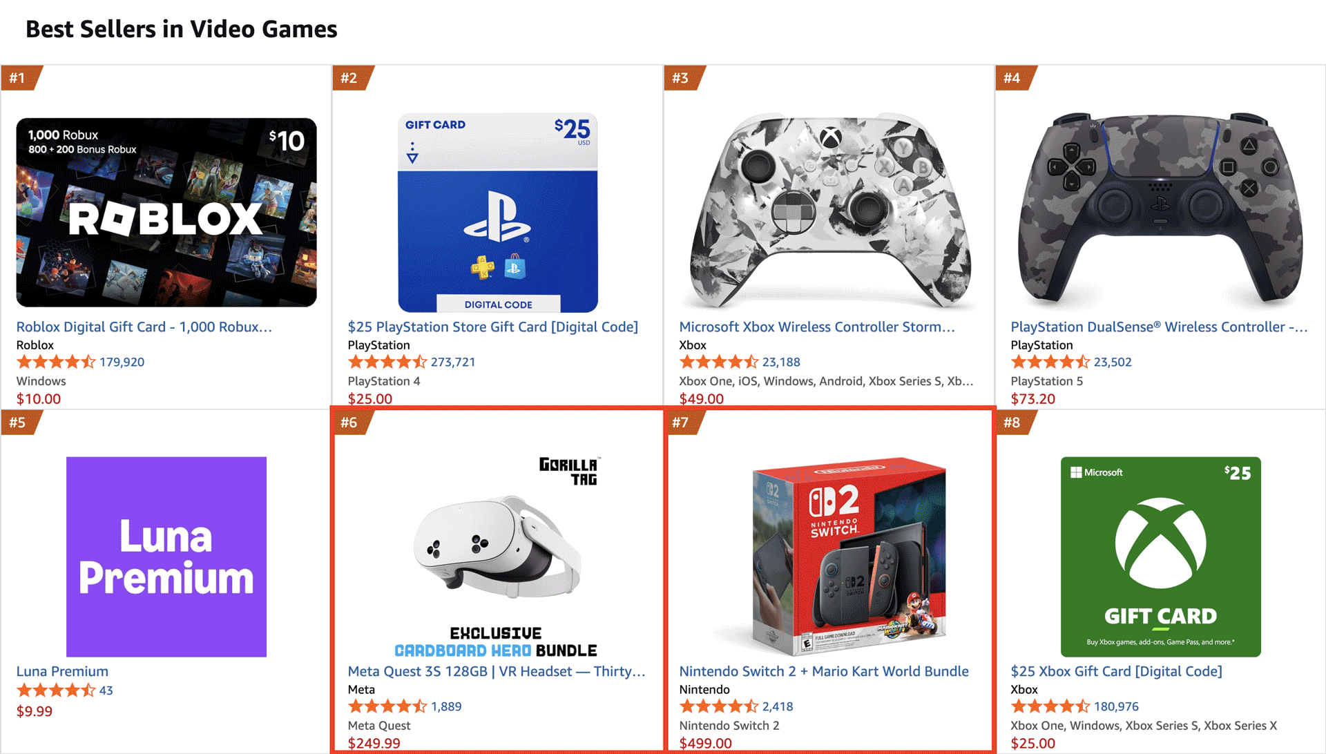 В списке бестселлеров видеоигр на Amazon, Meta’s Quest 3S (128GB) немного опережает популярный бандл Nintendo’s Switch 2. Quest 3S в настоящее время занимает 6-е место, а бандл Switch 2 — 7-е.