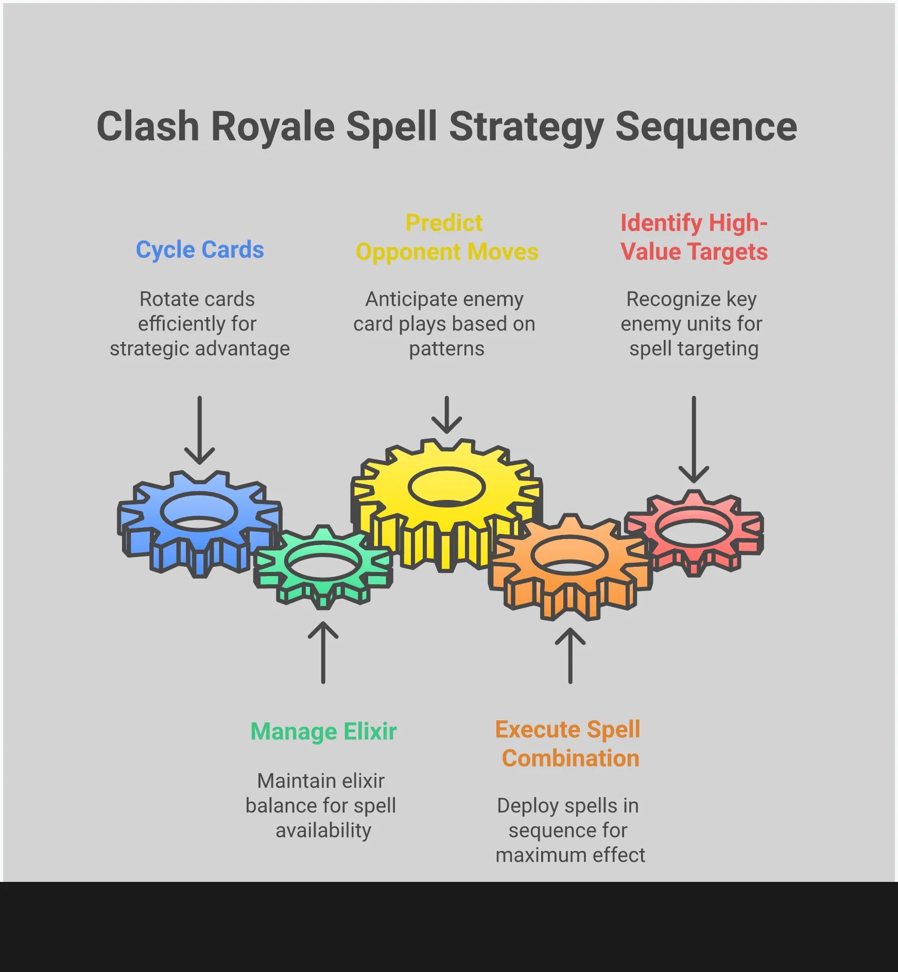 Самая большая ошибка, которую я вижу у игроков при использовании заклинаний, – это ожидание абсолютно *идеального* момента для их применения. Они часто удерживают заклинание, такое как Fireball, надеясь поразить группу сильных вражеских юнитов – Мага, Ведьму и Мушкетера сразу. Хотя это и отличный результат, он случается нечасто. Обычно лучше использовать ваше заклинание сейчас для хорошего обмена эликсиром, даже если это не идеально, чем рисковать потерять контроль над матчем, ожидая идеальной ситуации, которая может никогда не наступить.