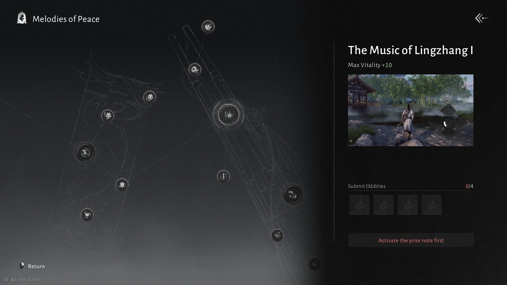 Дерево Мелодий Мира от Ци Шэна имеет ограничения, и даже максимальное его улучшение не предоставит достаточно ресурсов для самых мощных Мистических Навыков. Чтобы получить больше, вам нужно продвинуться до Кайфэна в Where Winds Meet и выполнить квест ‘Необычное: Охота за мелодиями’. Этот квест находится к западу от Путника в Амбаре Изобилия. Поговорите с Бай Цзи, другом Ци Шэна, и выполните его задания. После этого вам снова придется начать собирать Необычности, чтобы разблокировать дополнительные улучшения Жизненной Силы.