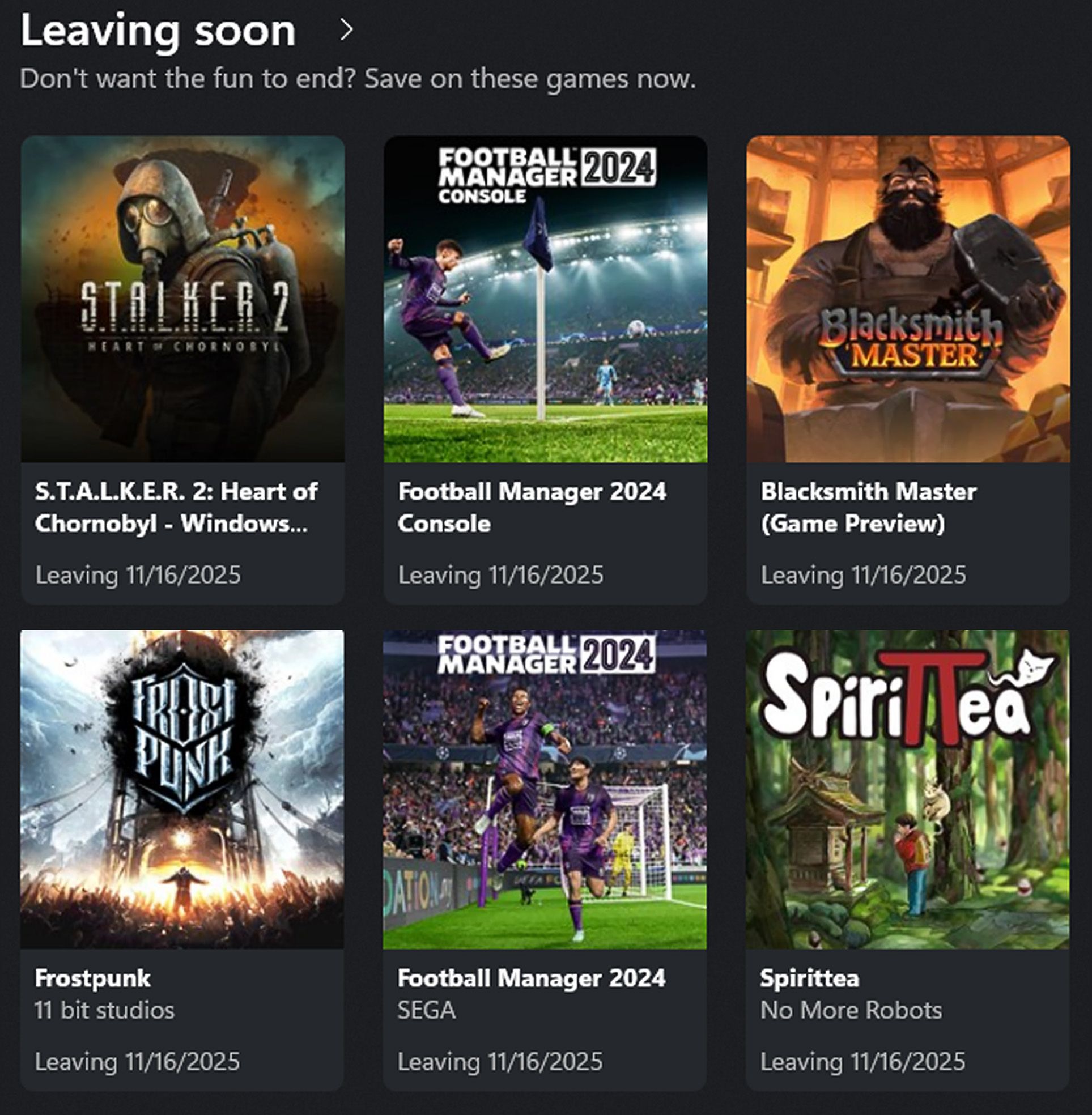 Пять игр будут удалены из Xbox Game Pass: Football Manager 2024, Frostpunk, Spirittea, S.T.A.L.K.E.R. 2: Heart of Chornobyl и Blacksmith Master. Вы можете увидеть шесть пунктов в приложении Xbox, потому что Football Manager 2024 указан дважды – один раз для PC-версии и один раз для консольной версии. Football Manager 2024 оставался в Game Pass на дополнительный год после того, как планы на его продолжение были отменены из-за трудностей с переходом на движок Unity. Прежде чем Football Manager 2024 будет удален, Football Manager 2026 будет добавлен в сервис 4 ноября.